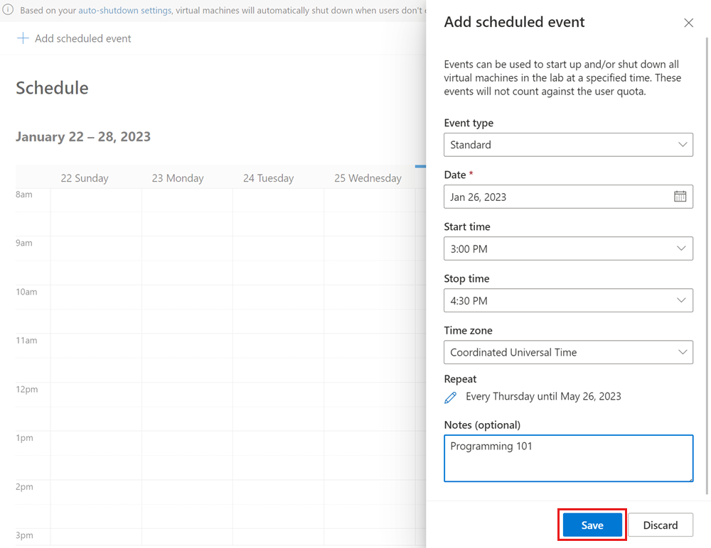 On the Schedule page for the lab, select Add scheduled event on the toolbar.