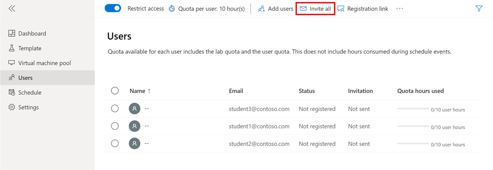 On the Users page for the lab, select Invite all on the toolbar.