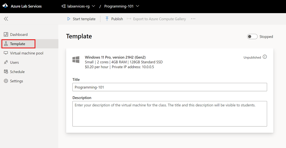 You use the Azure Lab Services website to create a customizable lab (lab template) in the lab plan. In Azure Lab Services, a lab contains the configuration and settings for creating lab VMs. All lab VMs in a lab are the same. In the next section, you customize the lab template for the classroom training.