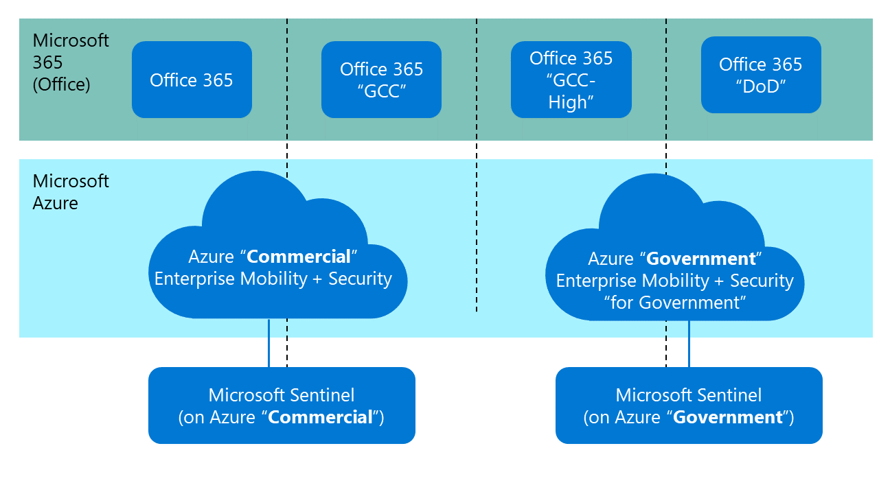 Microsoft Sentinel is built on Microsoft Azure environments—both commercial and government. Office 365 environments, like GCC, GCC-High and DoD, interface at different levels with Azure environments.