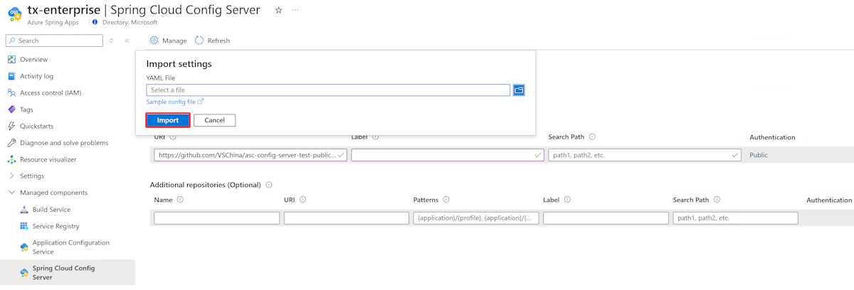 asyncoperation. Config Server should report success after 1-2 minutes. The information from your YAML file displays in the Azure portal.Select Apply to finish the import.
