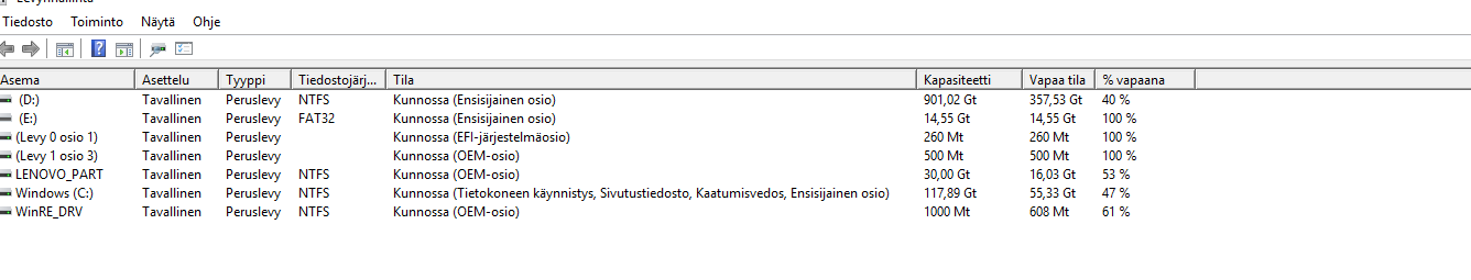 Voitko ottaa meille kuvakaappauksen Levynhallinnan näkymästäsi jossa näkyisivät kaikki kovalevyosiosi ja niiden koot? Voit avata levynhallinnan klikkaamalla Käynnistä-valikon ikonia hiiren kakkosnapilla ja valitsemalla sitten listalta Levynhallinta. Kuvankaappauksia taas saat otettua helposti esimerkiksi kuvankaappaustyökalulla NÄIDEN OHJEIDEN mukaan.