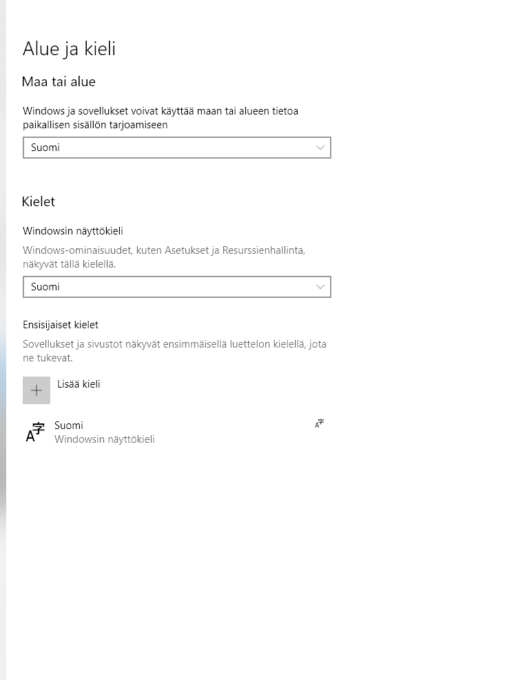 Noista "Alue ja kieli" -osion asetuksista voit ainakin helposti määrittää sen näppäimistökielen, jota haluat aina lähtökohtaisesti käyttää riippumatta siitä, minkä kielisiä ohjelmistoja, asiakirjoja tai muuta sisältöä tarkastelet tai käytät.
