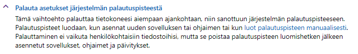 Jos ongelma alkoi ohjelman asennuksen tai päivityksen yhdeysessä, kokeile järjestelmän palauttamista palautustusympäristössä. Tämä löytyy vaihtoehtojen listalta ja antaa sinulle mahdollisuuden palata aijempaan palautuspisteeseen.Lisätietoa löydät täältä: