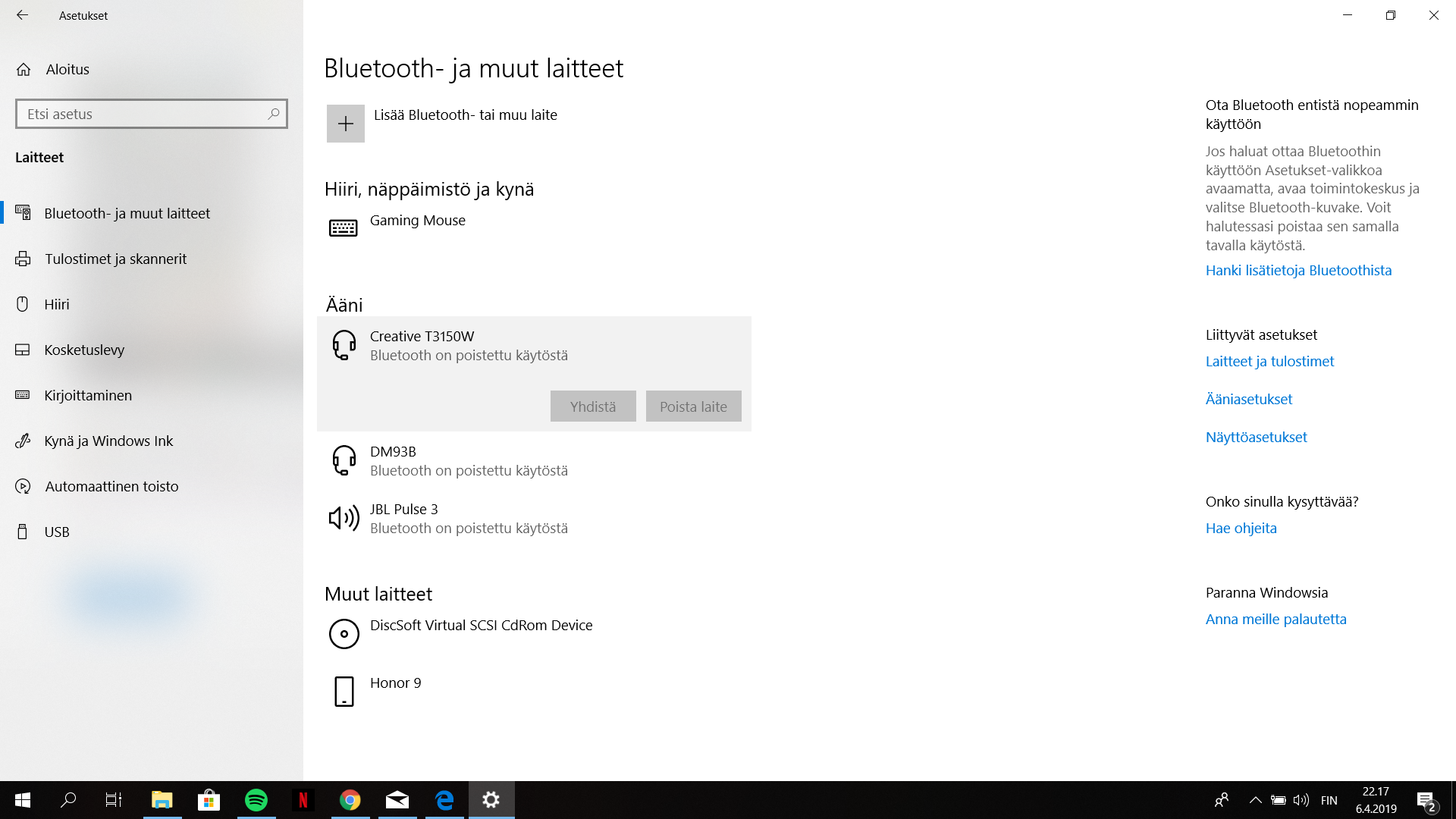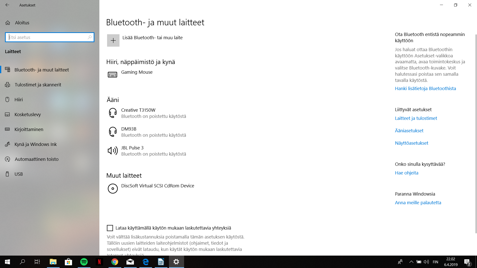 Ennen tuossa "Lisää bluetooth- tai muu laite" alapuolella on ollut niin sanottu vipu mistä on saanut bluetoothin päälle ja kiinni, enään ei.