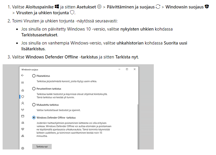 Jos haluat kuitenkin selvitellä nykyisen asennuksen mahdollisia ongelmia, niin suositan ensiksi että jos sinulla on jokin kolmannen osapuolen virussuojaohjelma käytössä, että poistat tämän asennuksen tilapäisesti. Tämän jälkeen suosittaisin, että tarkistat tietokoneen Windows Defender Offlinellä.