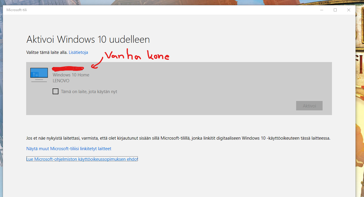 Haluaisin sitten seuraavaksi katsoa onko tämä lisenssi saatu joltain koululta? Tässä tapauksessa voisi olla aiheellista varmistaa koulun kanssa, että lisenssi on poistettu edellisestä kovalevystä. Voit katsoa myös seuraavat OHJEET AKTIVOINNISTA LAITTEISTOMUUTOKSEN JÄLKEEN. Nämä olit jo katsonut. Olisi hyödyllistä vielä varmistaa, ettei Windows versiosi olisi OEM-lisenssi. Tällöin siirto uuteen koneeseen ei onnistuisi.