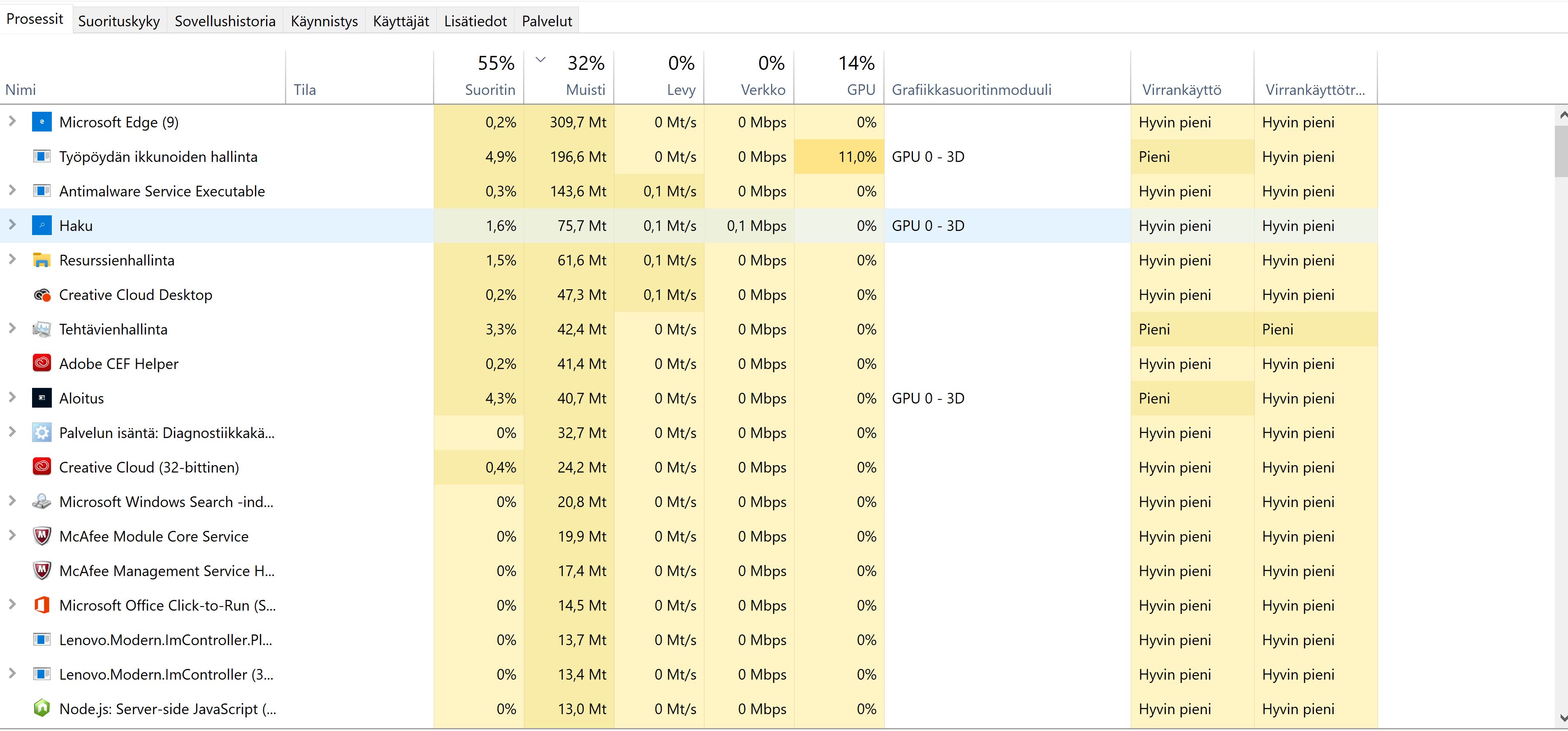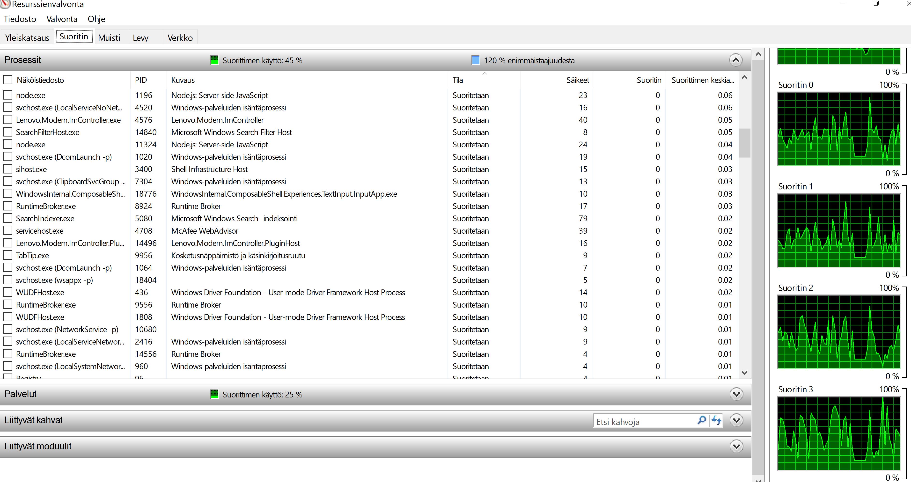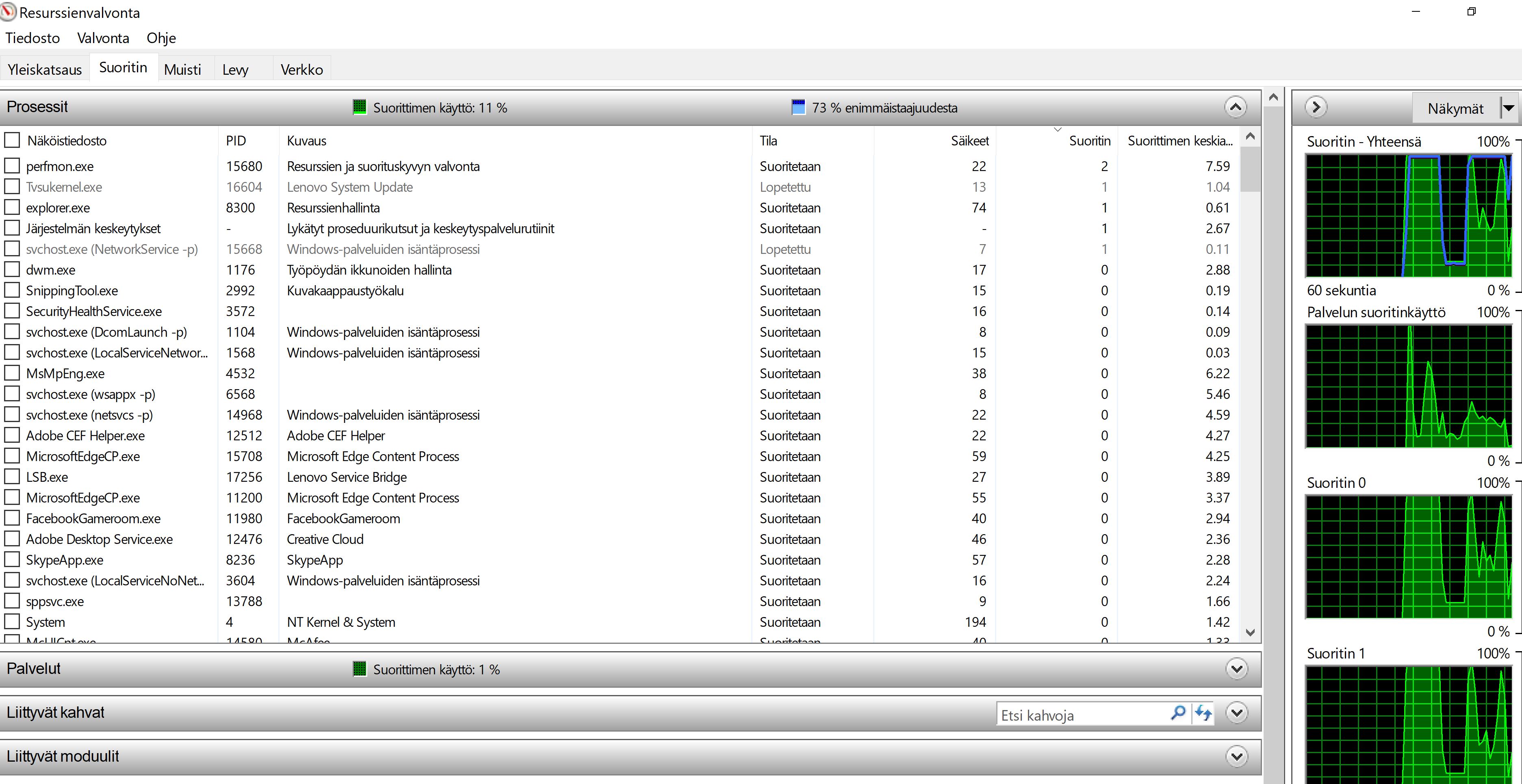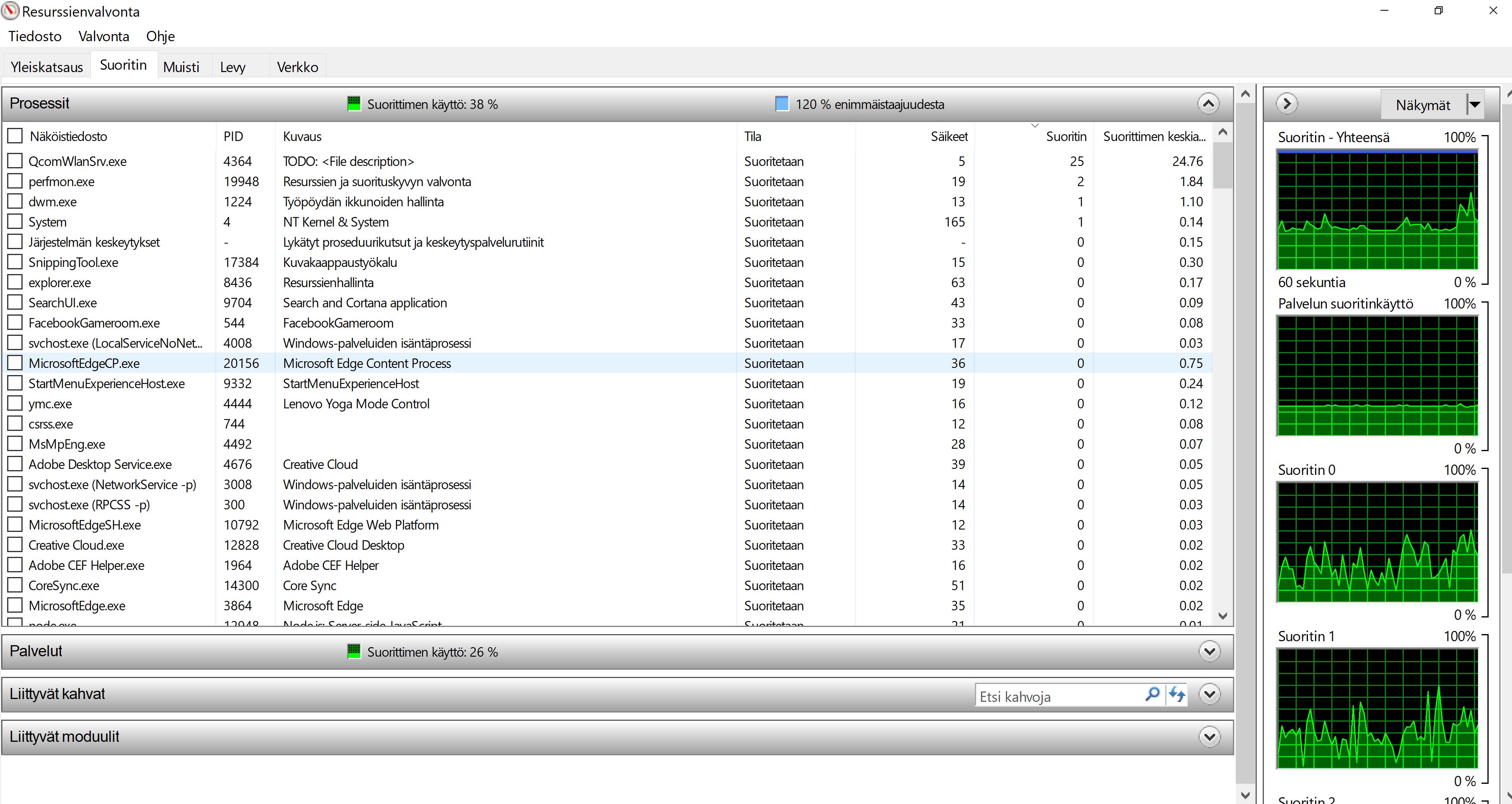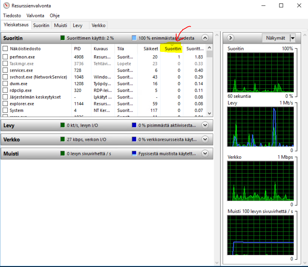 Kiitos näistä kuvista. Näistä näkyykin jo jotain, mutta et ollut järjestänyt Resurssienvalvontaa Suoritin-sarakkeen mukaan, joten vähän joudun nyt arvailemaan.
