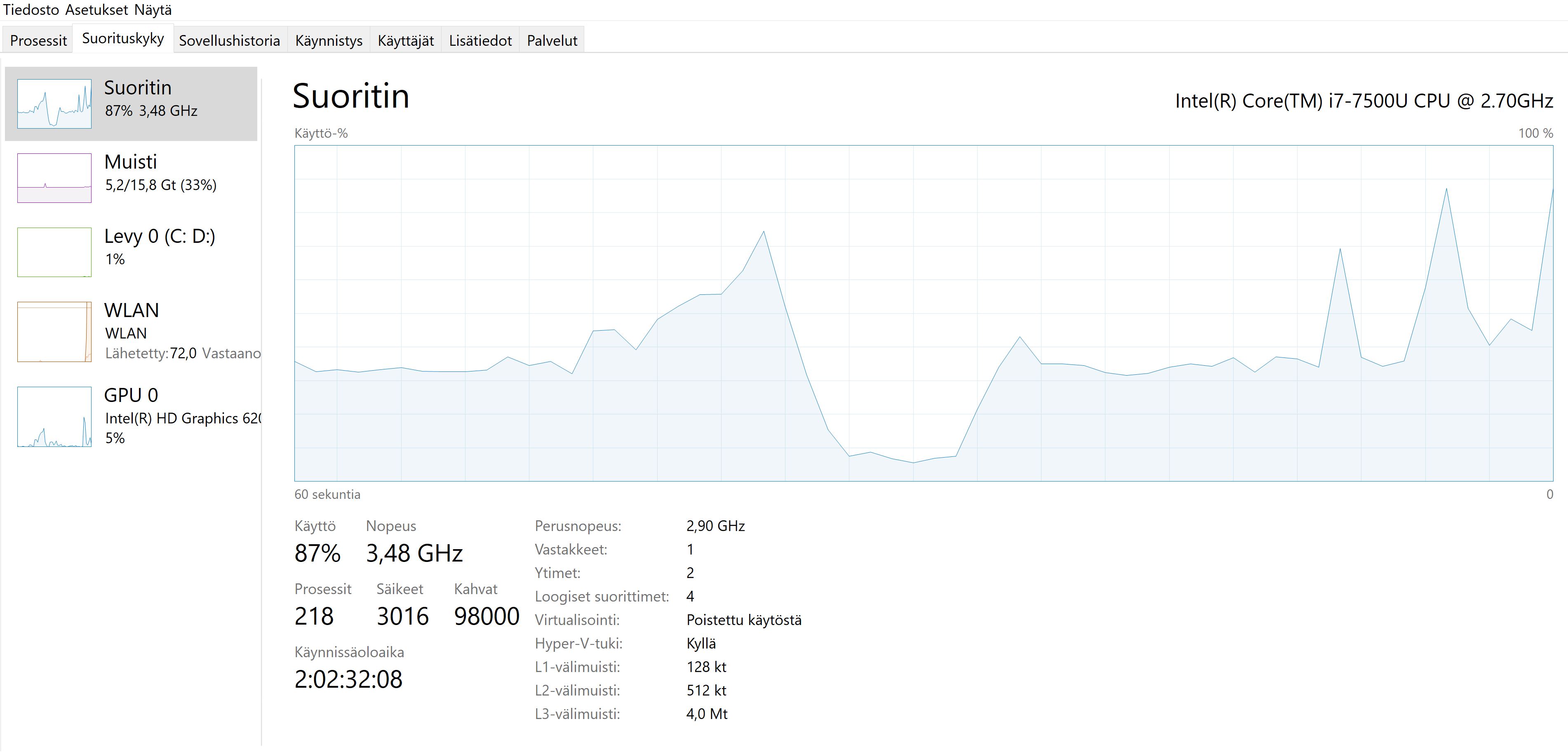 Näissä kuvissa näkyy, että suorittimen kellotaajuus on yli 100%, eli kone on tällä hetkellä ylikellotetussa tilassa.