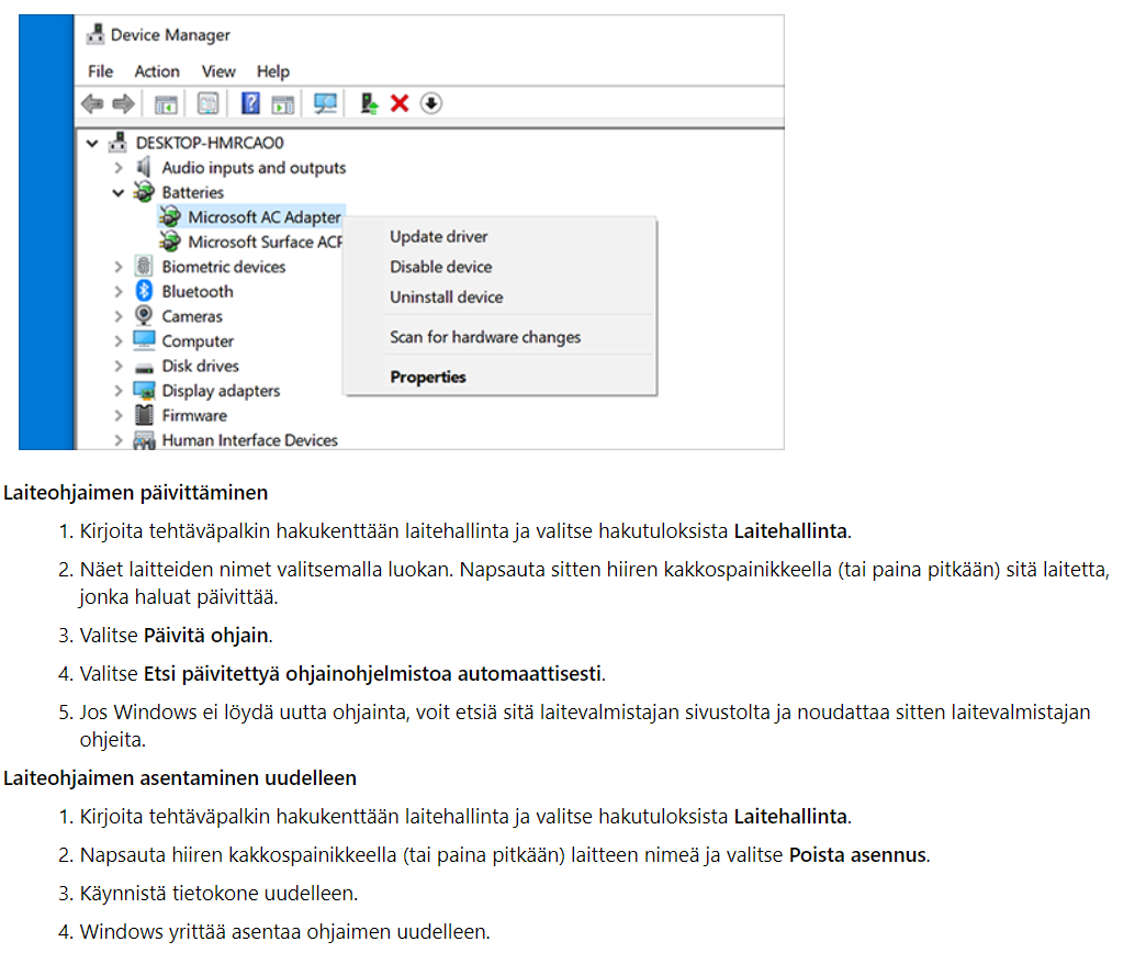 Voit myös kokeilla Microsoftin omaa ohjainta poistamalla asennetun ohjaimen.