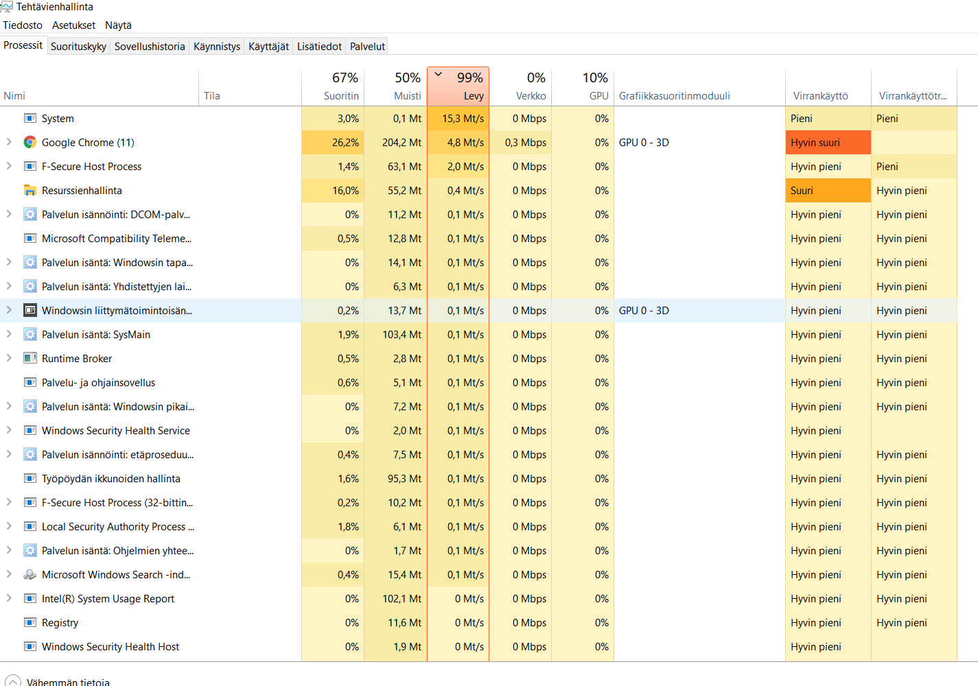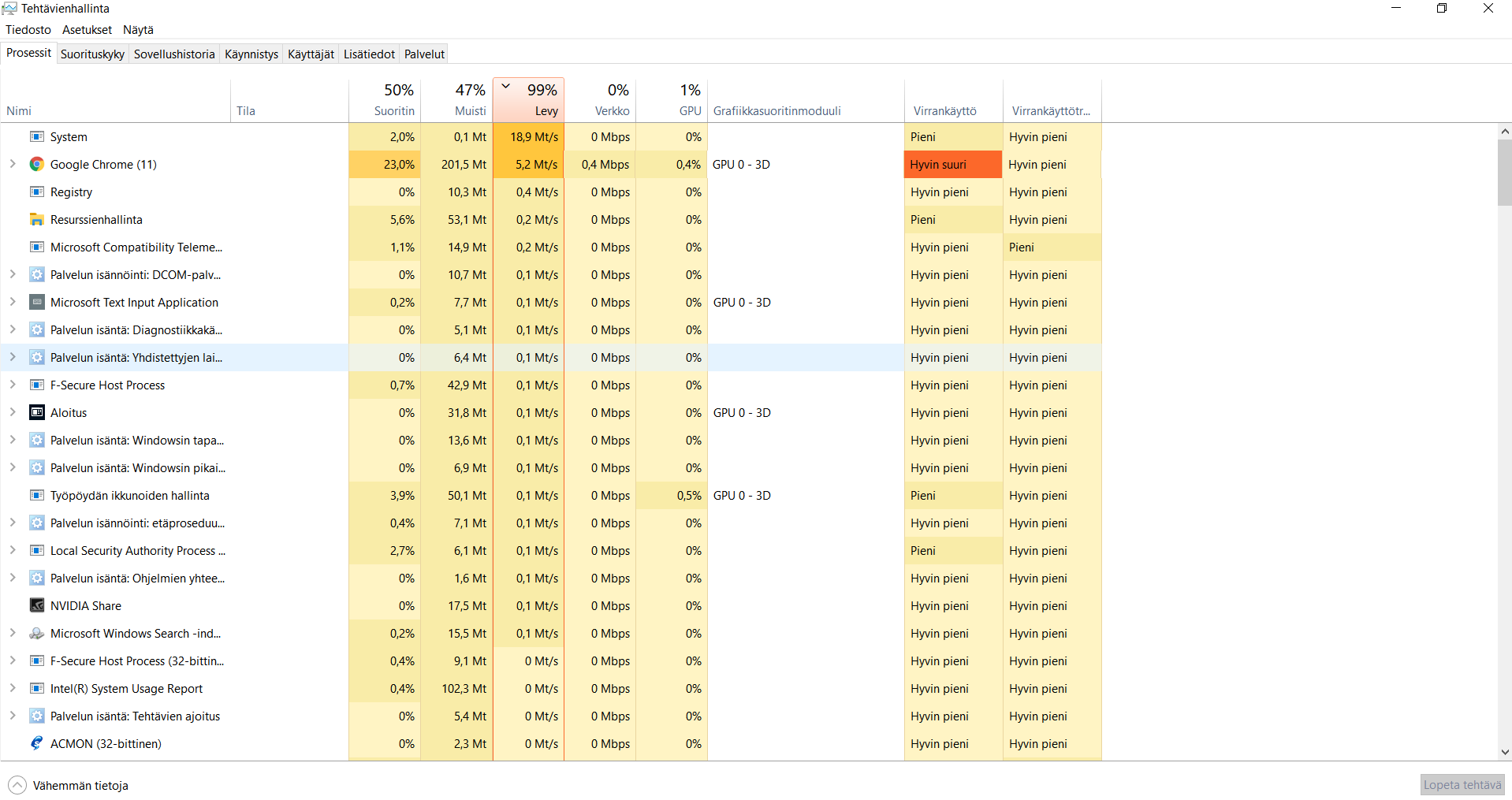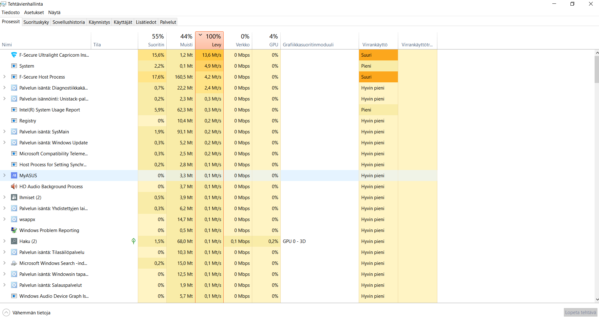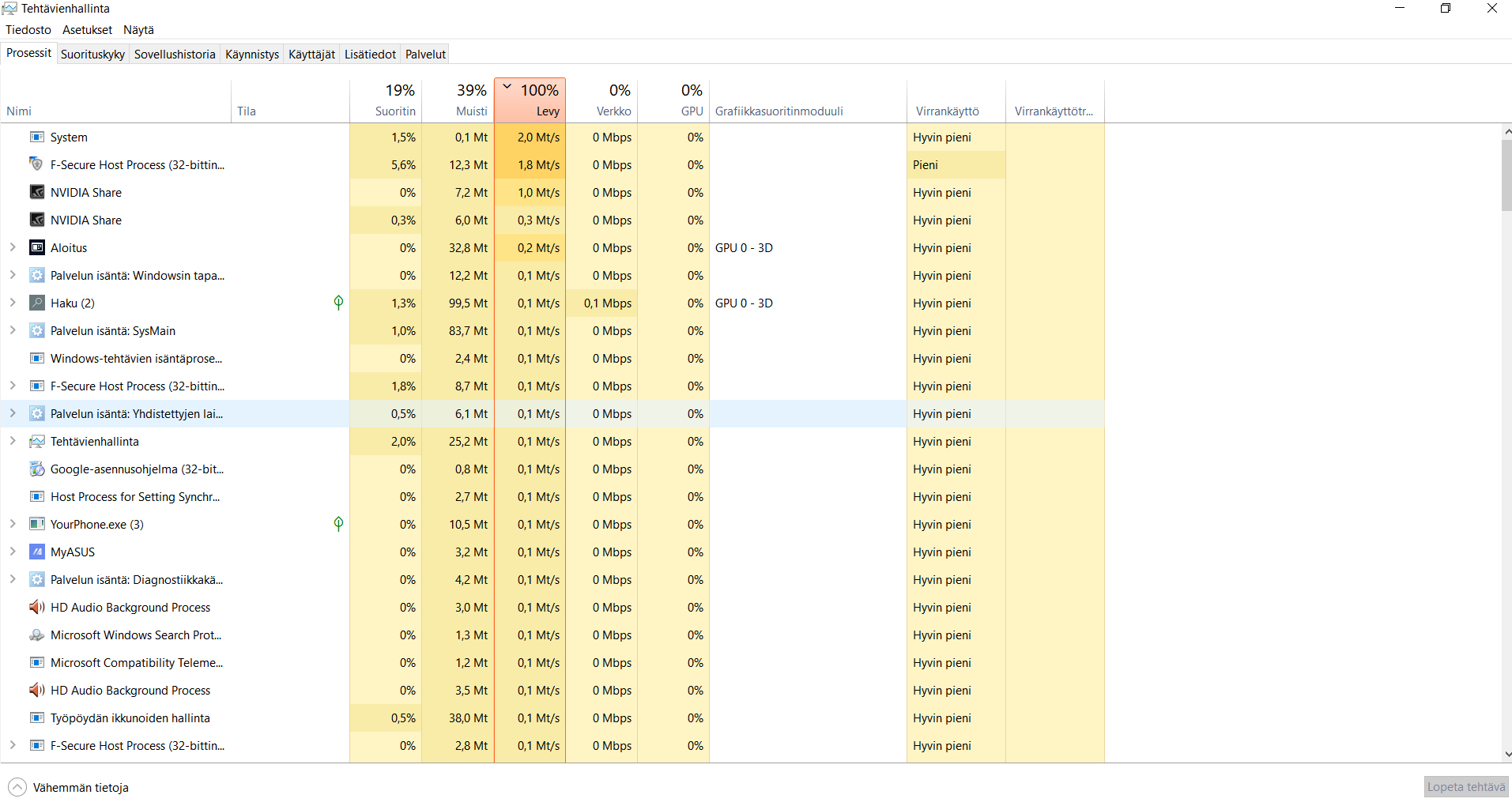 Hei, taidan tietääkin mistä tässä on kyse. Uskon, että F-Secure aiheuttaa suurta levynkäyttöä. Ja varsinkin silloin, kun avaa oikeastaan minkä vaan sovelluksen. Joten onko sinulla tietoa, mikä siihen voisi auttaa?