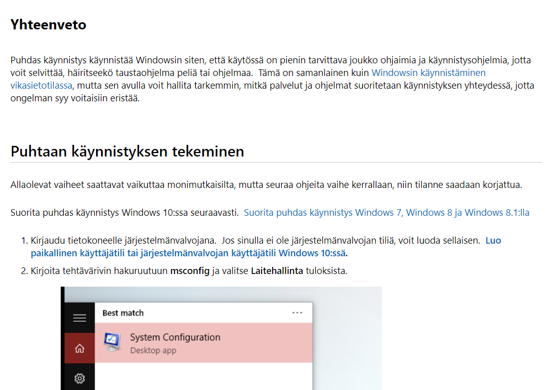 Näiden lisäksi vianselvityksenä suosittaisin, että tarkastat toistuuko ongelma vikasietotilassa tai puhtaan käynnistyksen tilassa.