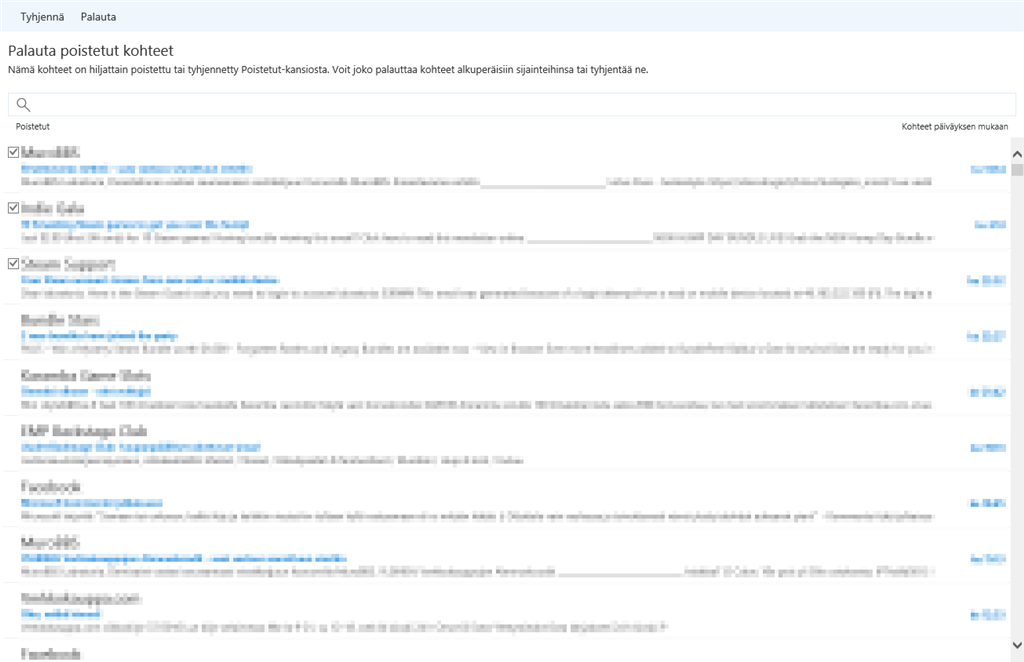 Mutta edelleen siis on kyse Palauta poistetut kohteet -sivun viesteistä. Näppäimistön pikanäppäimet-asetuksesta ei ole täällä hyötyä, koska viestejä voi valita mutta ei maalata ollenkaan.