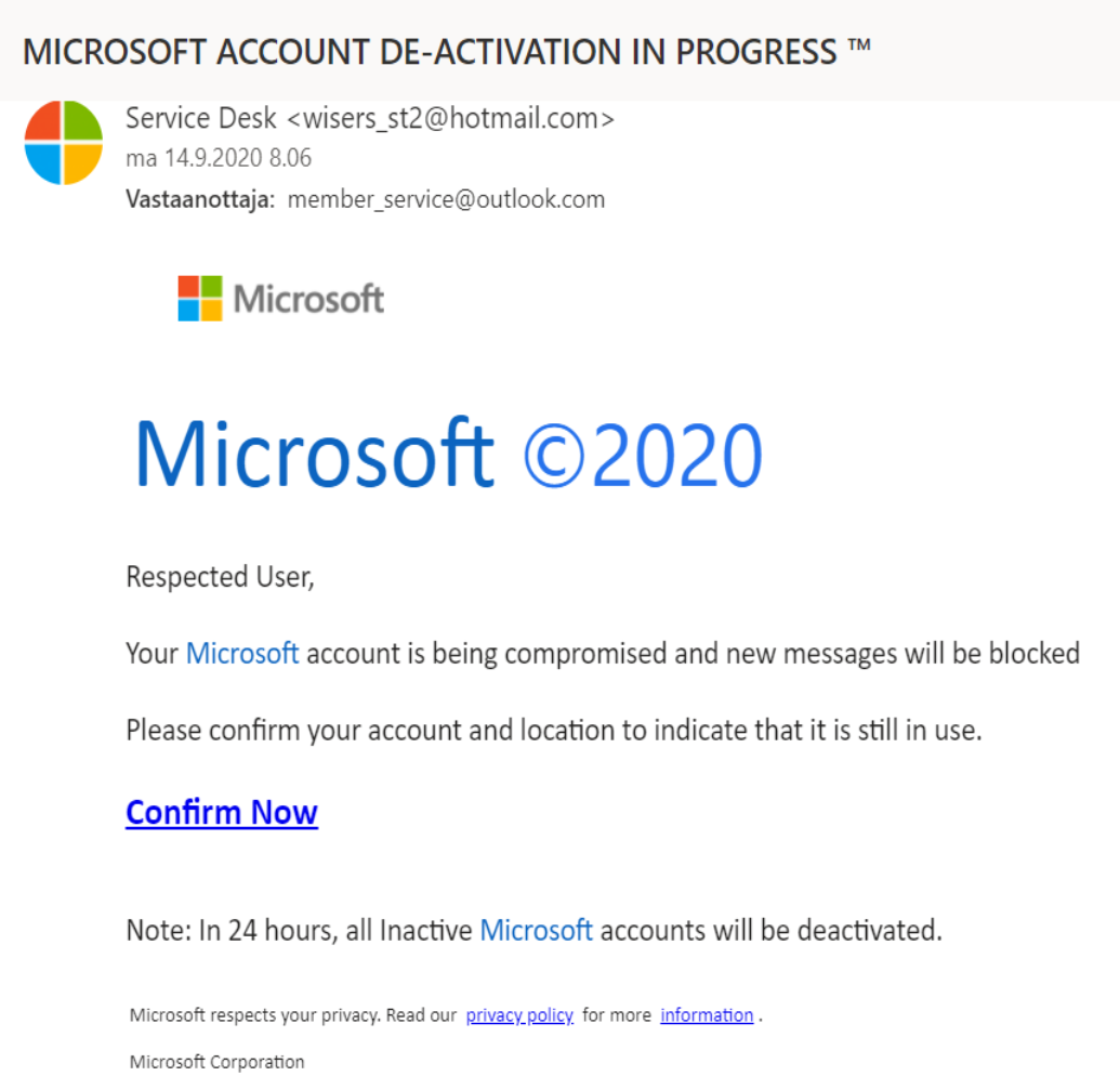 Itse asiassa, että sähköposti on phishing huijaus eikä laillista. Microsoft ei koskaan lähetä sähköposteja ilmoittaa sulkeminen sähköpostitilit. Omistaja voi sulkea tilit manuaalisesti tai jos tili on käyttämättömänä vähintään kahden vuoden ajan.