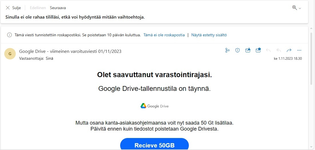 - Lähetä meille esimerkki kuvakaappauksesta ongelmasta. Peitä/poista kaikki henkilökohtaiset tiedot kuvasta Liitteenä on kuva yhdestä tämän päivän roskapostiviestistä, joka osoittaa, että lähettäjä tunnetaan vain yrityksen nimen kaltaisena. En tiedä sähköpostiosoitettani, ja siksi en voi vastata siihen tai estää sitä. Osoite. En tietenkään halua vastata tähän. Mutta jopa sen jälkeen huomaat, että osoitetta ei tiedetä ja on jotenkin onnistunut piilottamaan sen kokonaan sähköpostista. Joten todella vaikea estää tällaista sähköpostia. Ja niin nykyään kaikki saamani roskaposti on samaa, eli lähettäjäosoite on tuntematon.