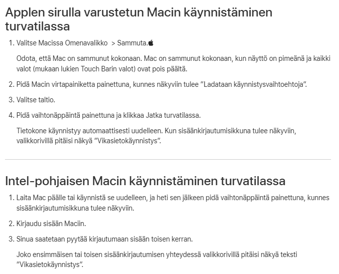 Lisätietoja: Käynnistä Mac turvatilassa - Apple-tuki (FI)