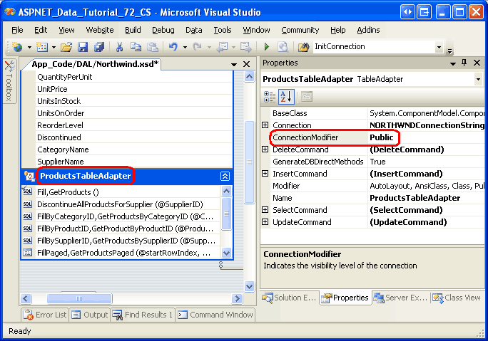 Open the Northwind DataSet, click on the ProductsTableAdapter in the Designer, and navigate to the Properties window. There you will see the ConnectionModifier set to its default value, Assembly. To make the Connection property available outside of the Typed DataSet s assembly, change the ConnectionModifier property to Public.