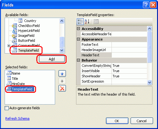 Figure 15: Add a New TemplateField to the GridView (Click to view full-size image)