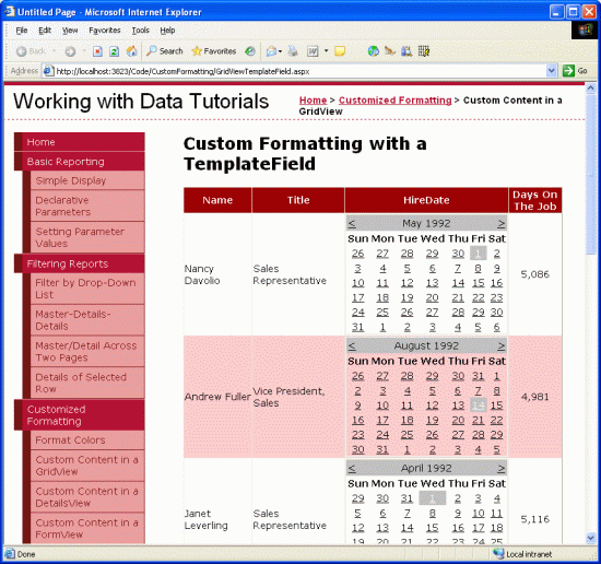 Displaying a data field value as text in a GridView is as simple as using a BoundField. For certain scenarios, however, the data is best expressed using a particular Web control instead of just text. Such customization of the display of data is possible with TemplateFields. For example, rather than display the employee's hire date as text, we could show a calendar (using the Calendar control) with their hire date highlighted.