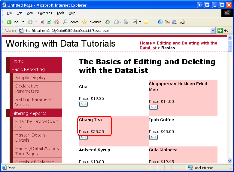 After updating Web.sitemap, take a moment to view the tutorials website through a browser. The menu on the left now includes items for the DataList editing and deleting tutorials.