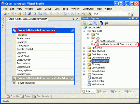 Rather than extend our existing DAL's TableAdapters to use optimistic concurrency (which would necessitate changing the BLL to accommodate), let's instead create a new Typed DataSet named NorthwindOptimisticConcurrency, to which we'll add a Products TableAdapter that uses optimistic concurrency. Following that, we'll create a ProductsOptimisticConcurrencyBLL Business Logic Layer class that has the appropriate modifications to support the optimistic concurrency DAL. Once this groundwork has been laid, we'll be ready to create the ASP.NET page.
