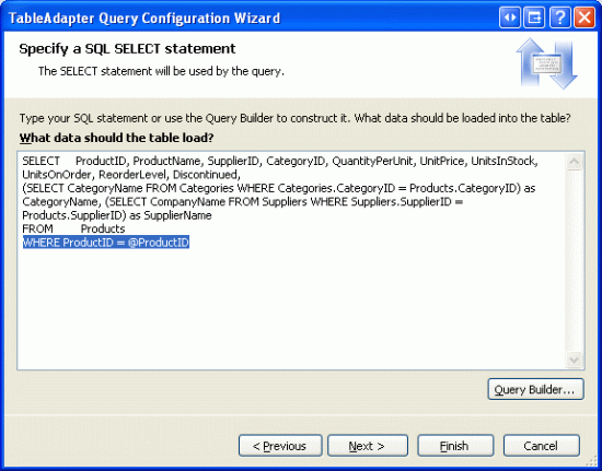 On the next screen we're prompted for the SQL query to use, with the TableAdapter's default query pre-loaded. Augment the existing query to include the clause WHERE ProductID = @ProductID, as shown in Figure 10.