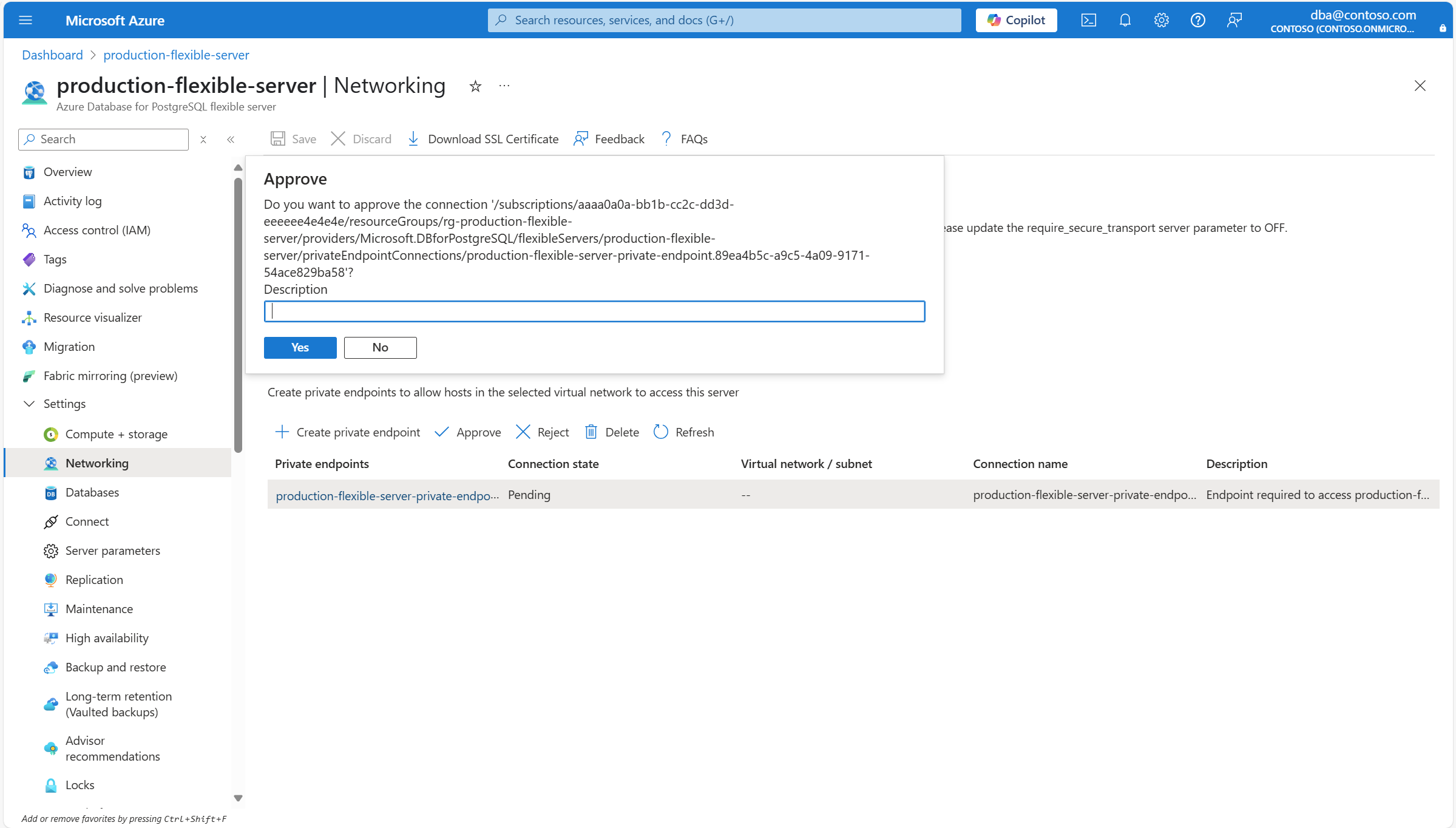 If you consider it necessary, in the Description box of the Approve dialog, type the reason why you're deciding to approve this private endpoint connection, and select Yes.