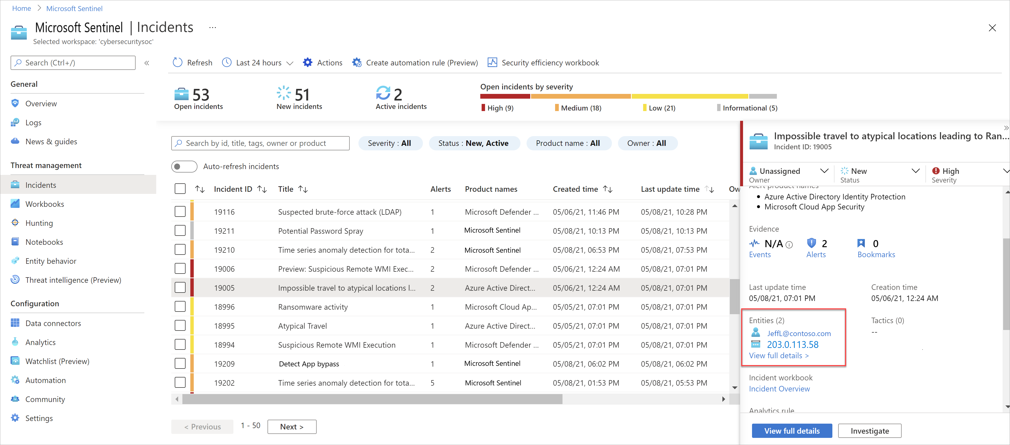 The user entity page is also linked from the incident page itself and the investigation graph.