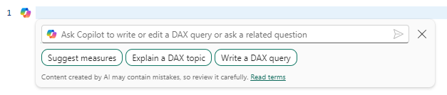 Sisäinen Copilot, joka löytyy Power BI:n DAX-kyselynäkymästä, joka on käytettävissä Power BI Desktopin DAX-kyselynäkymässä tai kirjoittaa DAX-kyselyitä Power BI -työtilaan, jotta mallin tekijät ja kuluttajat voivat pyytää apua DAX-kyselyiden luomisessa. Ohjeessa voidaan selittää DAX-kysely ja DAX-aiheet sekä luoda DAX-kyselyitä.