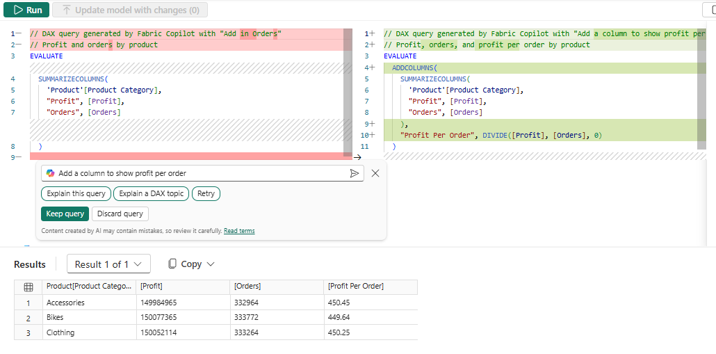DAX-kyselyeditorin erojen muotoilu näyttää nyt täsmälleen, mitä Copilot on muuttanut.