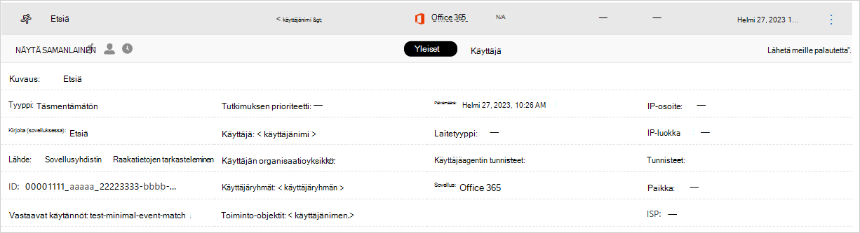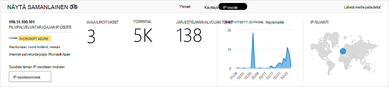 IP-osoiteluokka ja -tunnisteet: Valitse IP-tunniste, jos haluat tarkastella tästä toiminnosta löytyneiden IP-tunnisteiden luetteloa. Voit sitten suodattaa kaikkien tätä tunnistetta vastaavien aktiviteettien mukaan.