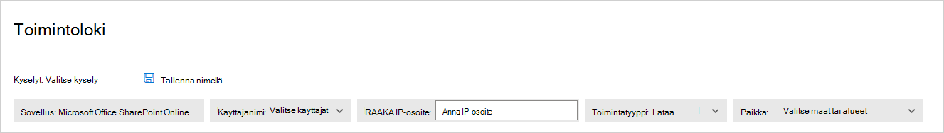 Toimintoloki voidaan suodattaa niin, että voit etsiä tiettyjä toimintoja. Voit luoda käytäntöjä aktiviteettien perusteella ja määrittää sitten, mistä haluat saada ilmoituksen ja käsitellä niitä. Voit etsiä tiettyjä tiedostoja koskevia toimintoja. Toimintojen tyyppi ja kustakin toiminnosta saatavat tiedot määräytyvät sovelluksen mukaan ja sen tietojen perusteella, millaisia tietoja sovellus voi tarjota.