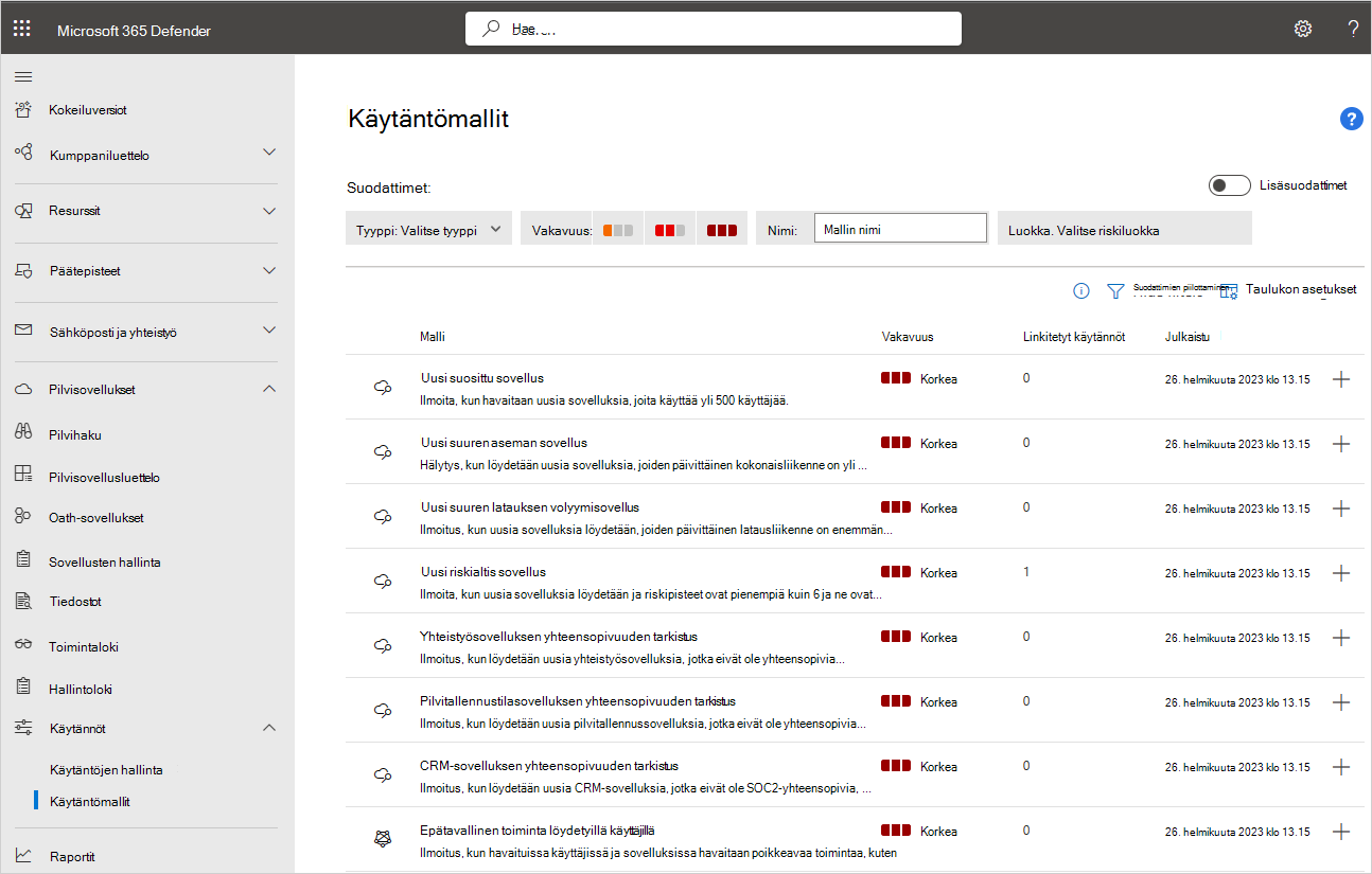 Jos haluat nähdä käytäntömallien täydellisen luettelon, siirry Microsoft Defender -portaalin Pilvisovellukset-kohdassa kohtaan Käytännöt ->Käytäntömallit. Esimerkki: