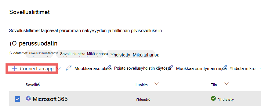 Valitse Sovellusliittimet-sivulla+Yhdistä sovellus ja valitse sitten Microsoft 365.
