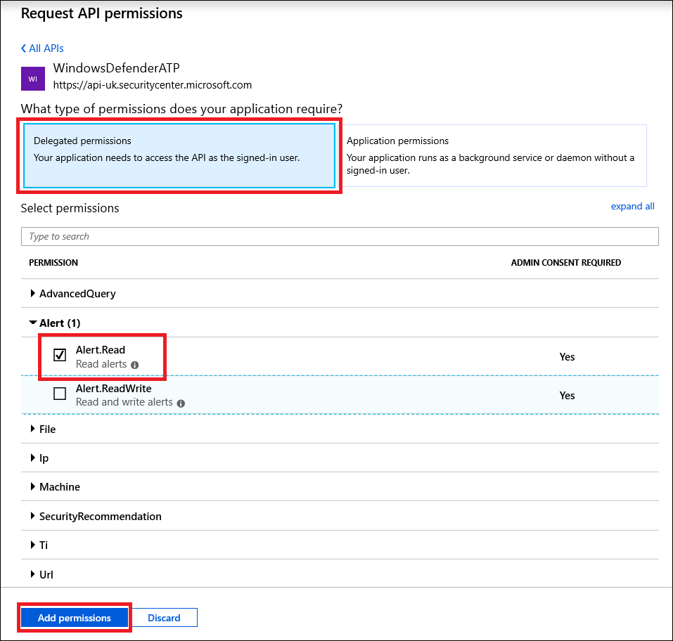 Anna sovelluksesi käyttää Microsoft Defender for Endpoint ja määritä sille Lukuilmoitukset-käyttöoikeus: