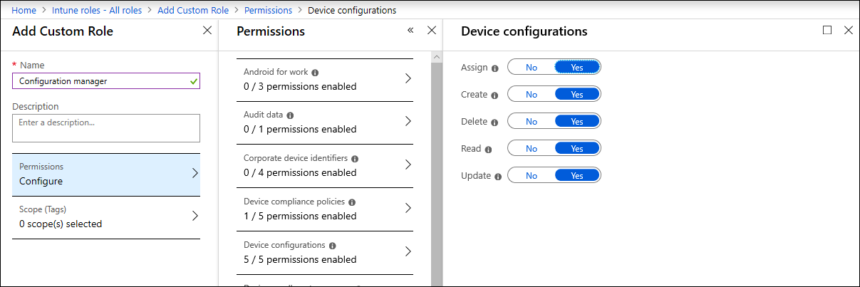Lisätietoja käyttöoikeuksien määrittämisestä Intune on artikkelissa Mukautettujen roolien luominen.