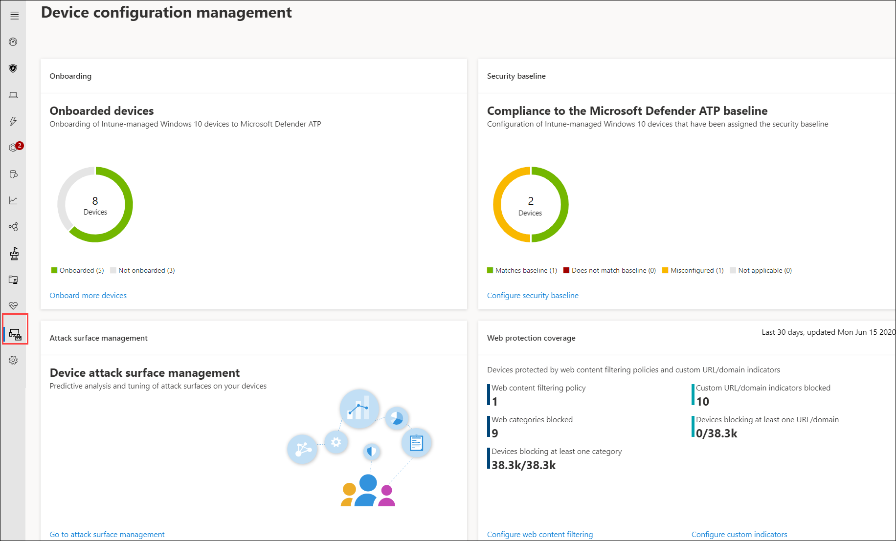 Voit seurata kokoonpanon tilaa organisaation tasolla ja ryhtyä nopeasti toimiin vastauksena heikkoon perehdytyskattavuuteen, yhteensopivuusongelmiin ja huonosti optimoituihin hyökkäyspinnan lievennyksiin suorilla, syvillä linkeillä laitteiden hallintasivuille Microsoft Intune ja Microsoft Defender portaalissa.