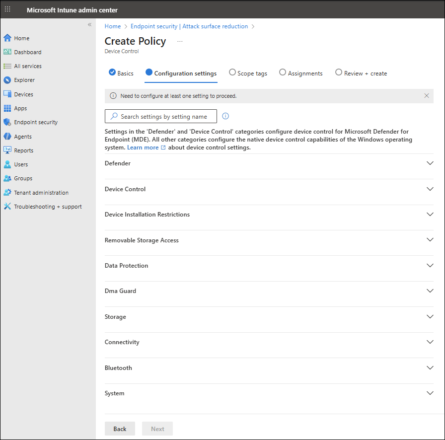 Jos käytät Intune Defender for Endpoint -asetusten hallintaan, voit käyttää sitä laitteen hallintaominaisuuksien käyttöönottoon ja hallintaan. Laitteen ohjausobjektin eri ominaisuuksia hallitaan eri tavalla Intune, kuten seuraavissa osissa on kuvattu.