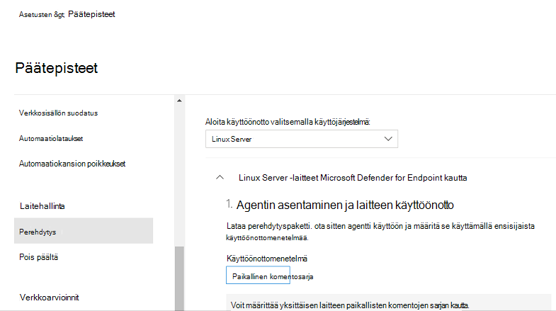Voit ottaa Defender for Endpointin käyttöön Linuxissa käyttämällä eri työkaluja ja menetelmiä. Tässä artikkelissa kerrotaan, miten voit automatisoida Defender for Endpointin käyttöönoton Linuxissa asennusohjelman komentosarjan avulla. Tämä komentosarja tunnistaa jakelun ja version, valitsee oikean säilön, määrittää laitteen hakemaan uusimman agentin version ja lisää laitteen Defender for Endpointiin perehdytyspaketin avulla. Tätä menetelmää suositellaan käyttöönottoprosessin yksinkertaistamiseen.