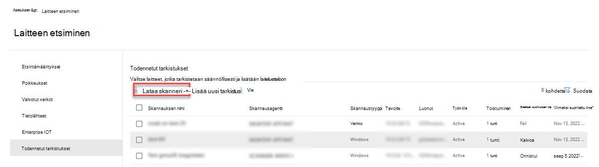 Siirry kohtaan Asetukset>Laitteen etsinnän>todennetut tarkistuksetMicrosoft Defender portaalissa.