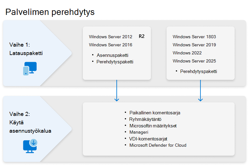 Paikallinen komentosarja (käyttää perehdytyspakettia) Defender for Servers Microsoft Configuration Manager Ryhmäkäytäntö VDI-komentosarjat Käyttöönotto Defender for Cloudin kanssa Moderni, yhdistetty ratkaisu Windows Server 2016 ja 2012 R2 |