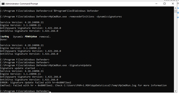 & "${env:ProgramFiles}\Windows Defender\MpCmdRun.exe" -SignatureUpdate -MMPCJos tämä komento toimii, ongelma saattaa olla se, että suojaustietojen varajärjestys on määritetty WSUS-palvelimeen ilman tietoturvatietojen hyväksymiä päivityksiä. Vaihtoehtoisesti UNC-jako voi olla vanhentunut tai Windows Update palvelussa voi olla ongelmia.