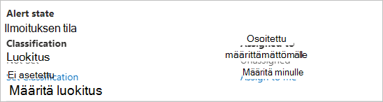 Voit luokitella hälytykset uusiksi, keskeneräisiksi tai ratkaistuiksi muuttamalla niiden tilaa tutkimusten edetessä. Näin voit järjestellä ja hallita sitä, miten tiimisi voi vastata hälytyksiin. Ryhmänjohtaja voi esimerkiksi tarkistaa kaikki uudet hälytykset ja päättää määrittää ne Keskeneräiset-jonoon lisäanalyyseja varten. Ryhmänjohtaja voi määrittää hälytyksen Ratkaistu-jonoon, jos hän tietää hälytyksen olevan hyvänlaatuinen tai tulevan laitteesta, jolla ei ole merkitystä (esimerkiksi suojausjärjestelmänvalvojalle kuuluvasta) tai jota käsitellään aiemman ilmoituksen kautta.