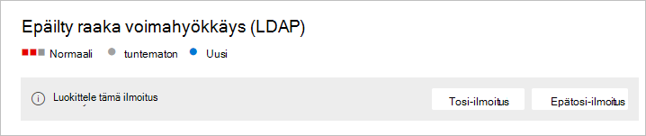 | Vakavuus | Hälytyksen vakavuus perustuu useisiin tekijöihin, kuten hyökkääjän käyttöoikeuksien todennäköisyyttä, hyökkäyksen onnistumisen mahdolliseen vaikutukseen ja todennäköisyyteen, että hälytys on tosi positiivinen. Täydellinen luettelo ilmoitustyypeistä ja niiden määritetyistä vakavuustasoista on kohdassa Suojausilmoituksen nimen yhdistäminen ja yksilölliset ulkoiset tunnukset |