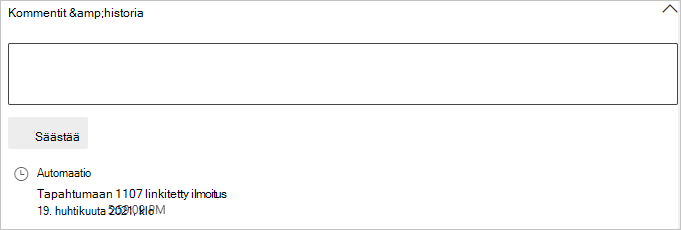 Voit lisätä kommentteja ilmoituksiin, jos haluat lisätietoja. Tästä on hyötyä merkityksellisten tietojen jakamisessa tiimisi kanssa tai tutkimusprosessin dokumentoimisessa. Aina kun ilmoituksiin tehdään muutos tai kommentti, se tallennetaan Kommentit ja historia -osioon.