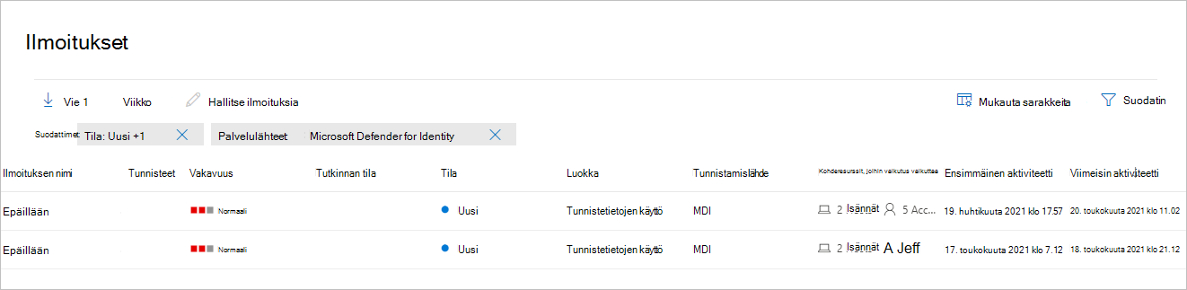 | Tunnistuslähteet | Voit suodattaa hälytyksiä seuraavien tunnistuslähteiden perusteella: Microsoft Defender for Identity tai Microsoft Defender XDR |
