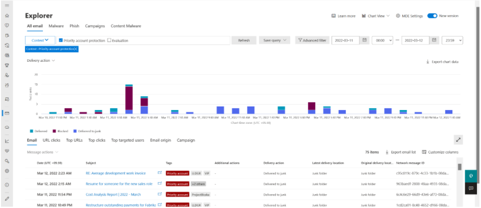 Voit tarkastella prioriteetin tilin suojauksen tuloksia Threat Explorerissa seuraavasti: