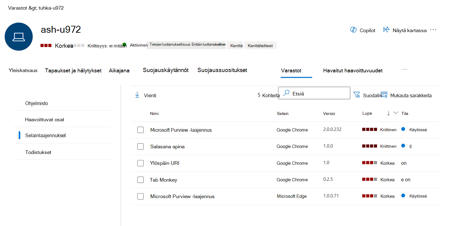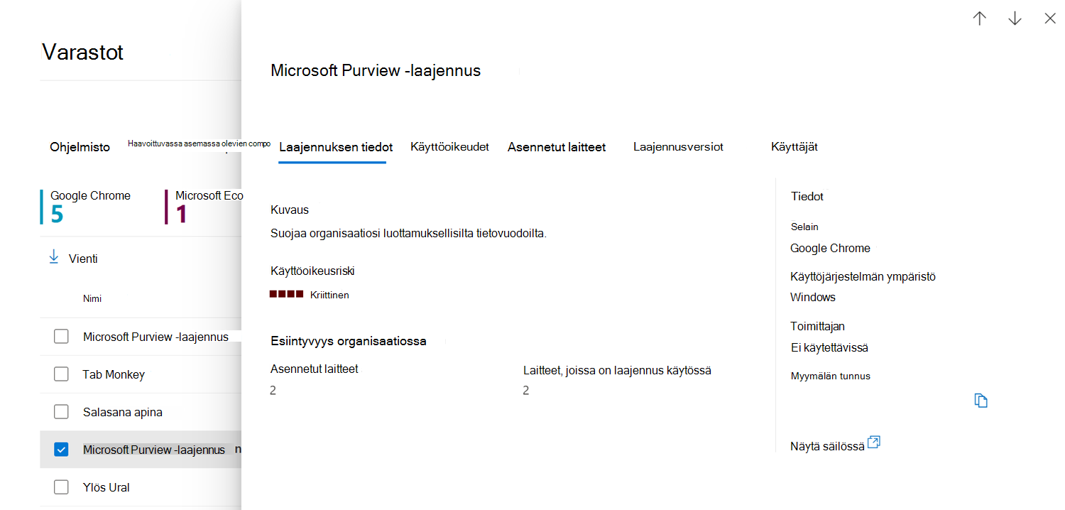 Saatavilla olevien tietojen avulla tietoturvatiimisi saa tietoa asennetuista laajennuksista ja päättää laajennusten hallinnasta käyttämällä näitä tietoja.