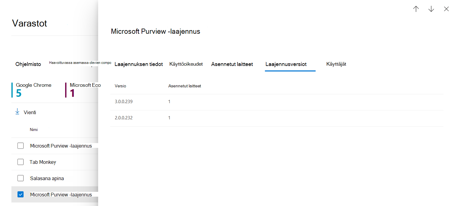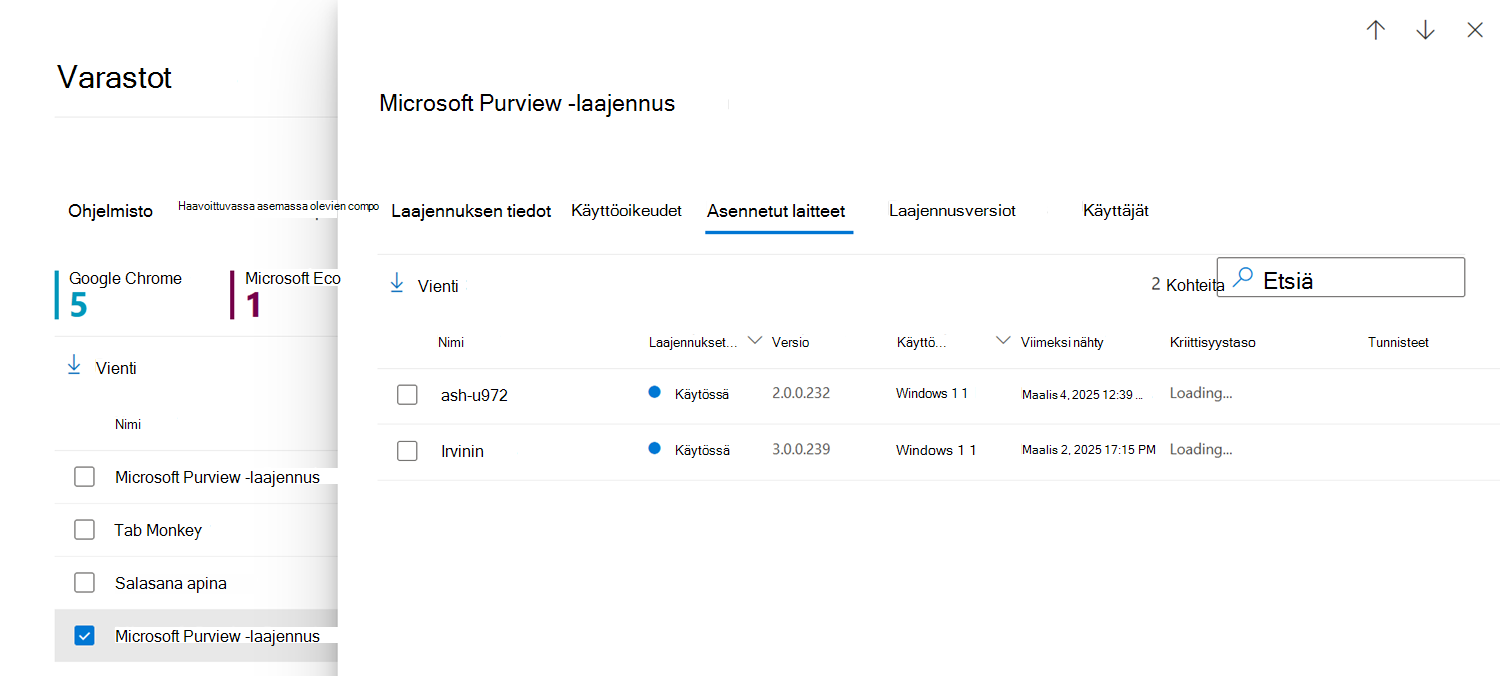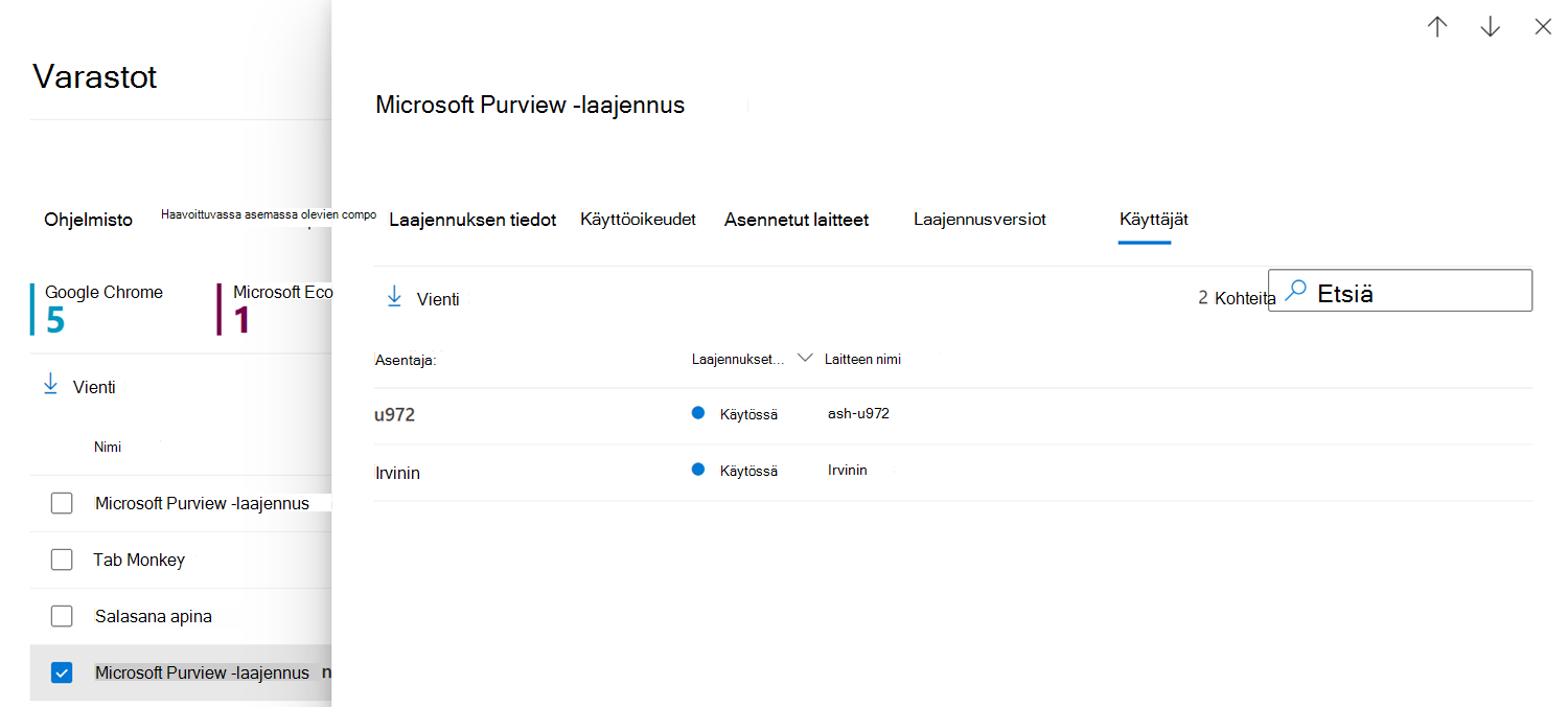 Selaimen laajennukset -sivulla näkyy luettelo organisaatiosi eri selaimista asennetuista selainlaajennuksista. Selaimen laajennuksen tiedot kerätään kaikilta käyttäjiltä, jotka ovat olemassa tietyssä selaimessa. Näet jokaisen asennetun laajennuksen selaimen mukaan laitteet, joihin se on asennettu, sen asentaneet käyttäjät ja sen, onko se otettu käyttöön tai poistettu käytöstä laitteessa.