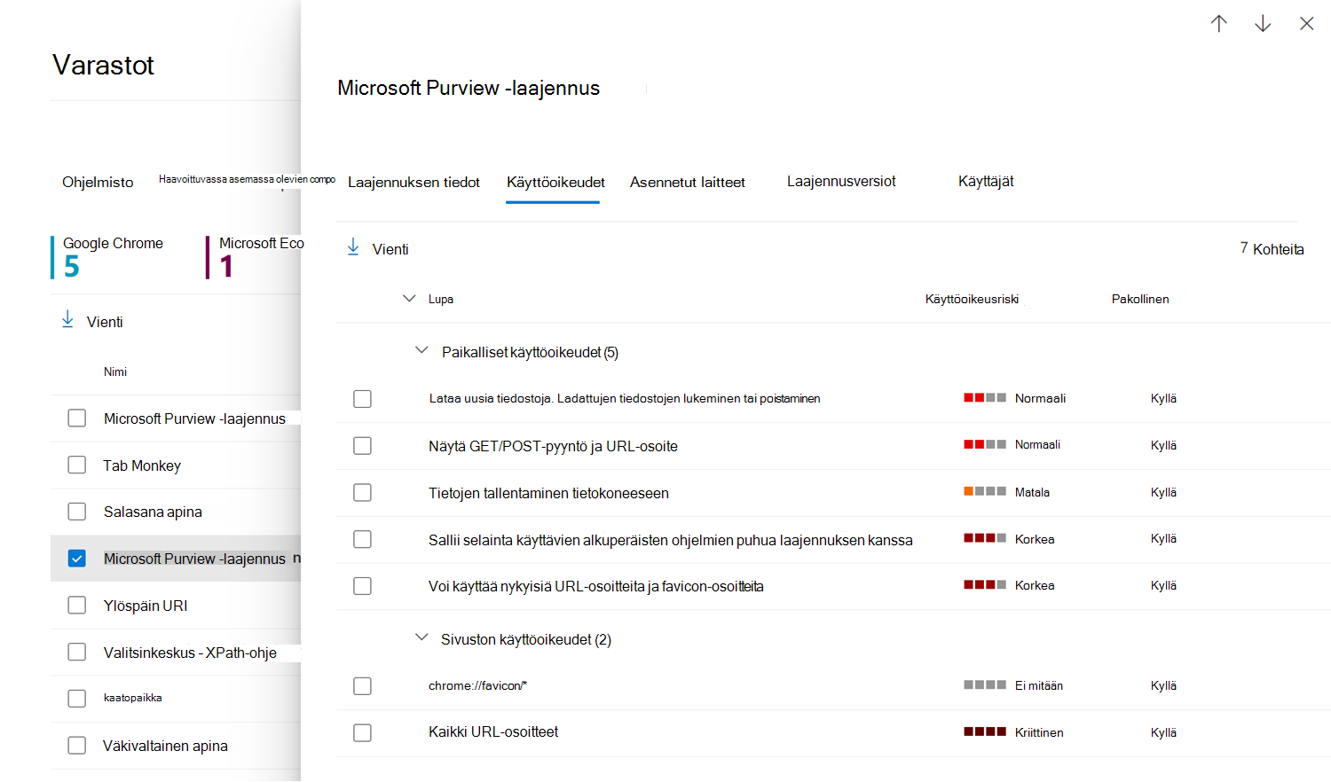 Pyydetyt käyttöoikeudet ja Käyttöoikeudet-riskisarakkeet antavat tarkempia tietoja laajennuksen pyytämien käyttöoikeuksien määrästä ja käyttöoikeusriskitasosta sen mukaan, minkä tyyppisiä käyttöoikeuksia se pyytää laitteille tai sivustoille.